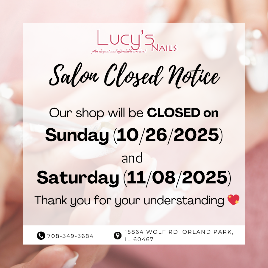 Lucy’s Nails and enjoy our happy time! Our goals are cleanliness and to make all clients satisfied. Therefore, you’ll feel a clean and elegant space when walking in. The tools and equipment we use are totally sterile. Besides, we try our best to complete our customer services – by updating hot trends and new styles. All the technicians are trained carefully in both skills and behavior – enthusiastic, creative, and professional.